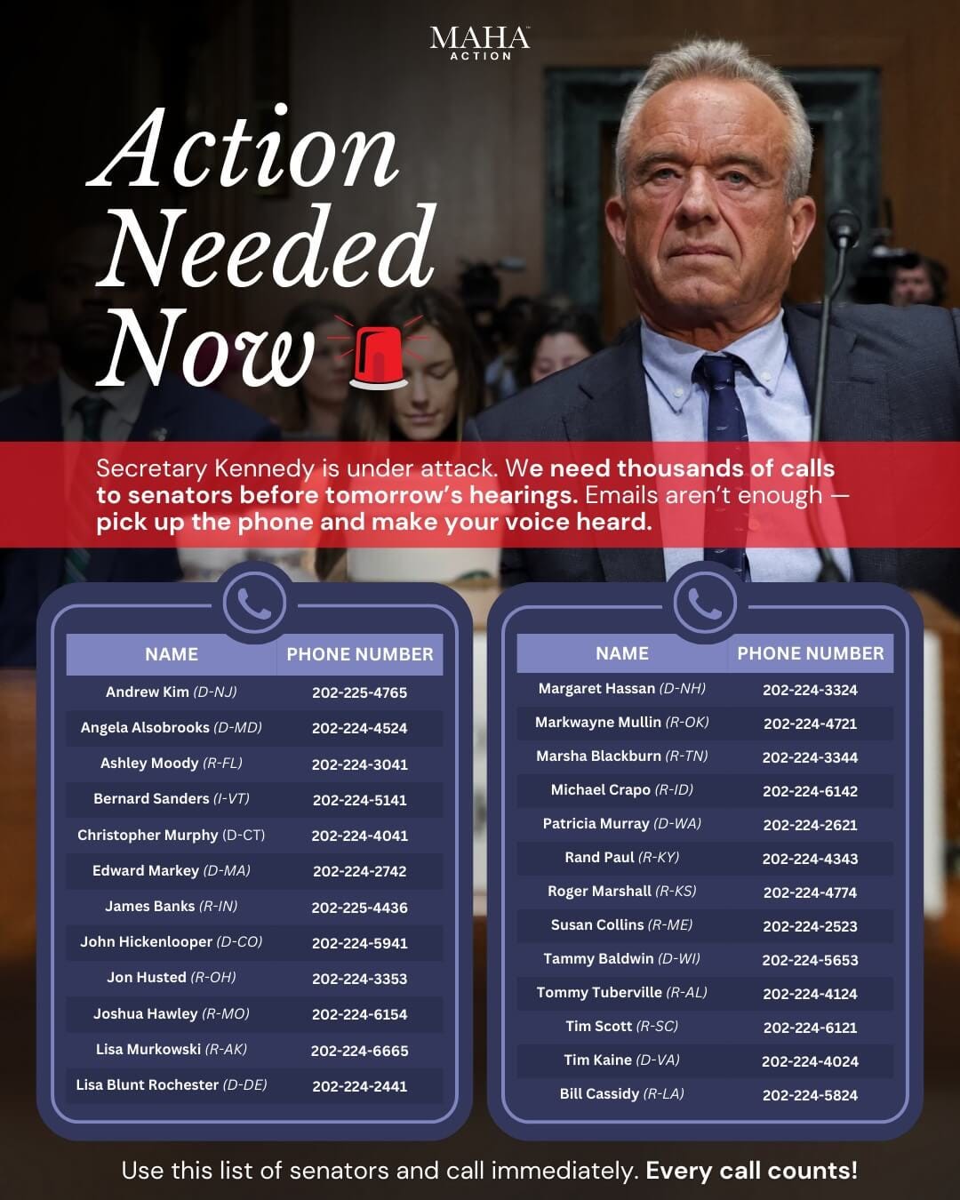 Please see the email below from Make America Healthy Again. There is a coordinated effort between Big Pharma, the media, and many in Congress who take large donations from Pharma, and want to stop RFK from exposing them. They need to see how large the support for RFK Jr. is, so they won’t go along with the push to remove him from his position as Secretary of Health and Human Services, where he is exposing the health and vaccine lies that have been promoted from this agency for decades. If you don’t have time to call all of them, call the Republicans first, as they are more likely to support Trump’s appointee. (The Democrats would probably vote as a bloc to fire Kennedy.) Especially call Senator Bill Cassidy, the last one on the list. He is an MD and an advocate for Big Pharma, who only reluctantly voted to confirm Kennedy.